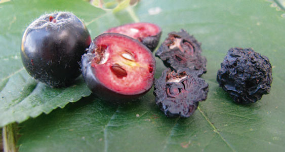 Neben Arteriosklerose werden dann auch andere degenerative Alterserkrankungen wie Diabetes, Altersdemenz, Rheuma, Gicht und Arthrose mit verursacht. Oxidativer Stress kann auch zu Mutationen führen und damit Krebs auslösen. Eine besondere Schutzwirkung für unseren Körper, besonders das Herz und die Blutgefäße besitzen auch die Aronia-Anthocyane. Ein hoher Cholesterinspiegel, Arterienverkalkung und hoher Blutdruck, die zu Herzinfarkt, Schlaganfall und Herzinsuffizienz führen können, werden durch Aronia-Anthocyane positiv beeinflusst. Einige Studien konnten die schützende Wirkung bei Krebsentstehung nachweisen. Die Anthocyane sind sehr starke Radikalfänger – sogenannte Antioxydantien – die freie Radikale neutralisieren und verhindern, dass es zu zellschädigendem oxidativen Stress kommt. Deshalb besitzen auch die Aronia-Anthocyane durch starke Bindung von freien Radikalen ein besonders hohes Potenzial. Dieses starke antioxidative Potenzial der Aroniabeere zeigt in tier- experimentellen Studien eine 60 bis 70%ige Reduzierung von Darmtumoren nach täglicher Ernährung mit Aroniafrüchten. Auch bösartige Gehirntumorzellen verlangsamten deutlich ihr Wachstum nach der Gabe von Aronia-Extrakten. Die neuesten Untersuchungen an der Universität of Maryland haben gezeigt, dass Aronia in Pulverform bemerkenswerte Apoptose (Zell-Selbstzerstörung) in verschiedenen Krebszellen verursacht. Da schon jeder vierte Deutsche in seinem Leben krebskrank wird, sollten wir durch einfache Prophylaxe mit sekundären Pflanzenstoffen diese Tendenz evident reduzieren.