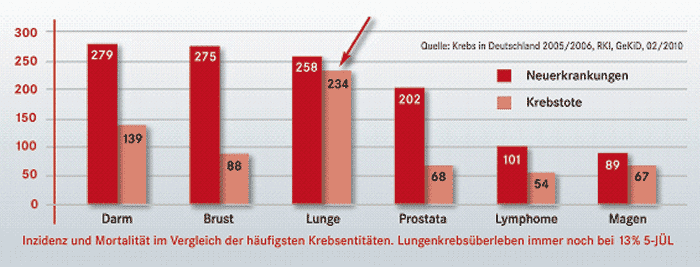 Inzidenz und Mortalität im Vergleich der häufigsten Krebsentitäten. Lungenkrebsüberleben immer noch bei 13% 5-JÜL Prävention und Screening Es ist eine der Besonderheiten der Lungentumore, dass sie vorwiegend durch äußere Ursachen entstehen. Die Hauptursache für das epitheliale Lungenkarzinom besteht im Inhalationsrauchen, der Tumor des Lungenfells (Pleuramesotheliom) entsteht durch die Inhalation von Krokydolithfasern (Asbest). Insbesondere das in Zigaretten enthaltene Benzpyren und polyzyklische Kohlenwasserstoffe scheinen für die Krebsentwicklung eine ursächliche Rolle zu spielen. Die darüber hinaus bekannten berufsbedingten Karzinogene wie radioaktive Aerosole, Metalle wie Arsen, Chrom, Nickel u.a. spielen als Auslöser für den Lungenkrebs eine vergleichsweise geringe Rolle. Die Hauptursache des Lungenkarzinoms ist das Rauchen (bis zu 90 %), die Prävention daher politisch, pädagogisch wie therapeutisch von zentraler Bedeutung. Für die Früherkennung gibt es bislang noch keine anerkannte Methode. Versuche, den Lungenkrebs durch systematische zytologische Sputum-Untersuchungen von großen Bevölkerungsgruppen oder auch durch Röntgenoder CT-Reihenuntersuchungen von Risikogruppen effektiv zu bekämpfen, haben sich bislang nicht durchsetzen können. Diagnose Dass sie an Lungenkrebs erkrankt sind, spüren Betroffene meist erst sehr spät. Symptome wie Luftnot, Bluthusten oder Schmerzen treten selten auf. Ebenfalls sind Allgemeinsymptome wie Gewichtsabnahme oder Nachtschweiß keine verlässlichen Frühsymptome. Uhrglasnägelbildung oder Gelenkschmerzen können in seltenen Fällen auf Lungenkrebs hinweisen. Wenn ein Schatten auf der Lunge entdeckt wird, kann dies Lungenkrebs oder aber auch nur eine entzündliche Veränderung zur Ursache haben. Aus diesem Grunde wird die Diagnose eines Lungentumors in aller Regel in Zusammenarbeit mit dem Pathologen durch eine Gewebeentnahme gestellt. Gutartige Tumoren treten nur zu ca. 3%, also sehr selten auf. Im Ergebnis gilt deswegen, dass bei einer Raumforderung größer als 8 mm durch eine Gewebeprobe geklärt werden sollte, ob es sich um einen bösartigen Lungenkrebs handelt. Bei der Gewebeentnahme sind die besonderen Bedingungen der Atemwege zu berücksichtigen. Über eine Spiegelung der Atemwege (Video-Bronchoskopie) können die großen Atemwege bis zur zweiten Segmentaufteilung der Luftwege eingesehen werden. Weiter ‚hinten’ in den Verzweigungen liegende Veränderungen lassen sich nur mit einer gleichzeitigen Röntgendurchleuchtung der Lunge erfassen. Bei der endoskopischen Diagnostik der Lunge kommt es leicht zu schweren Beeinträchtigungen, weswegen eine gründliche Überwachung während und auch nach der Untersuchung erforderlich ist. Zudem sind die Atemwege mit ihren 23 Verzweigungen auch bei anatomisch genauen Kenntnissen so angelegt, dass eine periphere Raumforderung beim Versuch einer Probenentnahme mit einer Bronchoskopie nur mit einer Wahrscheinlichkeit von 70 bis 80% erfasst wird. Gelingt dies nicht, so kann über spezielle Methoden, z.B. mit einer On-site-zytolopathologischen Bestimmung (ROSE), die Trefferquote erhöht werden. Alternativ kann die Gewebeentnahme über eine direkte Punktion von außen oder von innen mit einer Ultraschall- oder einer CT (Computertomographie)-Ansteuerung erfolgen. Hierzu stehen spezielle Nadeln und Sonden zur Verfügung. Wenn eine Raumforderung klein oder eine Gewebeentnahme sehr schwierig ist, lässt sich auch über eine Operation klären, ob ein bösartiger Tumor die Ursache der Veränderung ist. Der Umfang der Operation wird in diesem Fall während der Diagnostik mittels eines Schnellschnitts festgelegt. Bei der Bewertung der Gewebeproben ist zu berücksichtigen, dass auch Mischtumoren verschiedenen Gewebeursprungs auftreten können. Lungentumoren gehen meist vom Bronchialepithel, selten auch vom Alveolarepithel aus.