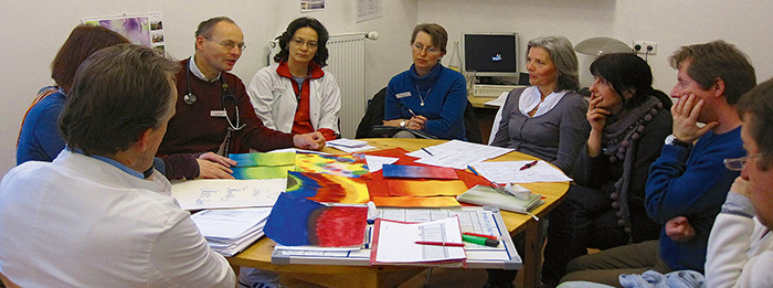 Interprofessionelle Therapiekonferenz in Havelhöhe Ein besonderes Instrument der Integrativen Onkologie im Gemeinschaftskrankenhaus Havelhöhe ist die interprofessionelle Therapiekonferenz. Dort erarbeitet ein Team aus Bezugspflegenden, Stations- und Bezugsärzten, Oberärzten, Palliativärzten, Psychoonkologen, Musik-, Kunst- und Atemtherapeuten, Vertretern der Physiotherapie, der Massage und der Eurythmietherapie sowie der Ernährungstherapie und der Sozialarbeit eine individuelle Empfehlung für komplementäre oder additive Therapien. Zu einer integrativ-onkologischen Behandlung des Lungenkarzinoms gehört zudem eine intensive Gesprächsbegleitung durch die betreuenden Ärzte und Therapeuten. Denn sowohl zum Zeitpunkt der Diagnosestellung also auch später im Krankheitsverlauf, wenn die Krankheit nach einer Erstlinientherapie fortschreitet, wie auch schließlich im fortgeschrittenen Stadium selbst, sind spezifische Anforderungen für die Betroffenen und die Angehörigen zu bewältigen. Neuere Untersuchungen zeigen, dass eine frühe und kompetente Begleitung nicht nur die Lebensqualität, sondern auch die Dauer des Überlebens positiv beeinflussen kann (7). Die Prognose des Lungenkarzinoms ist – auf alle Stadien bezogen – nach wie vor sehr schlecht. Für eine kleine Gruppe von Patienten ist sie aber deutlich besser geworden. Das macht Mut und gibt Hoffnung für weitere Fortschritte. Dies stellt Lungenkrebszentren bei der Begleitung ihrer Patienten vor eine besondere Aufgabe: Einerseits sollte fortwährend ein ehrlicher und klarer Austausch über den Stand der Erkrankung stattfinden, andererseits gilt es, jede Therapiechance vor dem Hintergrund der ganzen Persönlichkeit und Biographie des Patienten, wie auch des sozialen Umfeldes, zu betrachten und abzuwägen. Aus der Hoffnung auf kleine Erfolge in der Therapie können Betroffene und Fachleute gemeinsam Wert und Motivation im Kampf mit dieser Krankheit schöpfen. (Literaturquellen 1-7 bei der Redaktion)