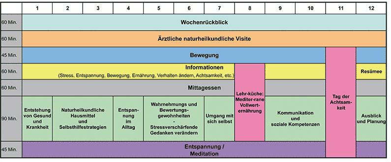 Jeder Therapietag weist eine analoge Struktur auf. Nach dem 1. Einführungstag beginnt jeder Tag mit dem Wochenrückblick. In der ärztlich-naturheilkundlichen Visite besteht die Möglichkeit, Fragen und Probleme zum Krankheits-, Behandlungs- und Genesungsprozess aus naturheilkundlicher Perspektive zu klären und zu besprechen. Ärztliche Informationen zu ergänzenden naturheilkundlichen Methoden werden an die individuellen Probleme der Teilnehmenden angepasst. So finden beispielsweise Kneippsche Güsse, Wickel, Auflagen, Rezepturen bewährter Heilkräutertees, Akupressur oder (Selbst-) Massagetechniken Berücksichtigung. Die Bewegungseinheiten bieten durch verschiedene aktivierende Bewegungsformen (aktivierende Bewegungsübungen, Walking und/oder Nordic Walking) und meditative Bewegungsformen (Yoga und/oder Qigong) die Möglichkeit, Beweglichkeit, Muskelkräftigung, Kondition, Körperwahrnehmung und auch Fatigue und Depression zu verbessern.