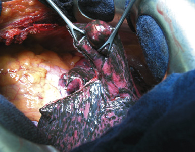 Abb. 2 Intraoperativer Befund; Keilresektion einer Lungenmetastase (Segment 8, links) Angesichts einer zentralen Metastasierung mit Einbeziehung der blutgefäß- und nervennahen Strukturen kann im Einzelfall auch die Pneumonektomie notwendig sein. Falls die funktionellen Reserven eine anatomische Resektion nicht erlauben, muss mittels Neodym-YAG Laser eine atypische Resektion aus zentralen Lungenabschnitten oder bei multipler Metastasierung versucht werden. Mit 10 bis 15% werden postoperative Komplikationen nach pulmonaler Metastasektomie angegeben. Dabei sind besonders die rezidivierende postoperative Sekretretention mit Atelektasebildung und Pneumonie, Herzrhythmusstörungen sowie bronchopleurale Fisteln zu nennen. Die Morbidität wird wesentlich vom Allgemeinzustand, Zugangsweg und Ausmaß der Resektion bestimmt. Strahlentherapie Die stereotaktische Bestrahlung (ein millimetergenaues, hocheffektives und umliegende Organe schonendes Verfahren) ist eine effektive und gleichzeitig schonende, nichtinvasive Behandlungsalternative solitärer Lungenmetastasen bei funktionell inoperablen Patienten. Durch aufwändige Bestrahlungsplanung und präzise Strahlführung können in ein bis fünf Bestrahlungsfraktionen biologisch effektive Dosen von insgesamt mehr als 100Gy appliziert werden. Gleichzeitig wird durch einen steilen Dosisgradienten am Rande des Befundes eine maximale Schonung des umliegenden gesunden Gewebes sicher gestellt. Selbst bei Metastasen der als strahlenresistent geltenden Melanome und Nierenzellkarzinome lassen sich durch die stereotaktische Bestrahlung lokale Kontrollraten von 88 Prozent nach 18 Monaten erreichen. Therapiebedingte Nebenwirkungen sind aufgrund der kleinen Bestrahlungsvolumina selten. Spezielle Aspekte verschiedener Primärtumore KoIon-Rektum-Karzinom Die Lungenmetastasenchirurgie stellt bei 1–2% der Patienten mit kolorektalem Karzinom eine Behandlungsoption dar. Während Patienten im Stadium IV unter Einsatz moderner Antikörpertherapien ein medianes Überleben von bis zu 24 Monaten aufweisen, kann hingegen nach Metastasektomie eine 5-Jahres Überlebensrate von bis zu 68% erreicht werden. Bei gleichzeitigem Vorhandensein von Lebermetastasen wird nach sequentieller pulmonaler und hepatischer Metastasektomie eine 5-Jahres-Überlebensrate von 42% berichtet. Dabei wird sowohl eine metachrone gegenüber der synchronen Metastasierung als auch eine Zeitfolge des primären Auftretens von Lebermetastasen vor einer Lungenmetastasierung als prognostisch günstig bewertet. Für die Resektion von Lebermetastasen wird aktuell der Stellenwert einer begleitenden (neo-)adjuvanten Chemotherapie diskutiert. Inwieweit ähnliche Behandlungskonzepte für die Metastasenchirurgie an der Lunge Bedeutung gewinnen können, bleibt abzuwarten. Nierenzellkarzinom Nierenzellkarzinome metastasieren bevorzugt in der Lunge, wobei dies sowohl hämatogen als auch lymphogen geschehen kann. Wenngleich Systemtherapien mit Tyrosinkinasinhibitoren und mTOR-Inhibitoren mit einer Verbesserung des progressionsfreien Überlebens einhergehen, bleibt die Lungenmetastasenchirurgie in einem kurativen Behandlungskonzept akzeptiert. Günstige Voraussetzungen für die Operation sind metachron auftretende, solitäre Herdbefunde oder wenige periphere Läsionen. 10-Jahres-Überlebensraten nach Lungenmetastasenresektionen sind mit 42% berichtet worden. Mammakarzinom Das fortgeschrittene Mammakarzinom infiltriert häufig Lunge und Pleura durch direkte Invasion oder durch die im Körper verteilte Streuung über die Lymphbahnen oder über die Blutbahn. Patientinnen mit isolierten Lungenmetastasen finden sich selten, in der Regel ist eine lokale oder diffuse Lymphangiose mit einzelnen oder multiplen Lungenmetastasen anzutreffen. Für Patienten mit metachroner Metastasierung und limitierter Anzahl von Herdbefunden, vornehmlich in einem Lungenlappen, werden nach Resektion der Lungenmetastasen und nach Ausschöpfung aller Optionen der Systemtherapie Langzeitergebnisse mit 5-Jahres-Überlebensraten von 40 bis 50 % berichtet. Nicht-seminomatöse Keimzelltumore Für die nicht-seminomatösen Hodentumore gilt, dass nach erfolgter Chemotherapie (Cisplatinhaltige Kombinationen) möglichst alle verbliebenen Läsionen entfernt werden. Wenngleich ein Ansprechen auf die Chemotherapie oft von einem drastischen Abfall der Tumormarker (-Fetoprotein, ß-HCG) begleitet ist, entbindet die Normalisierung der Tumormarker nicht von der Entfernung von Resttumoren in der Lunge. Diese können in der histologischen Aufarbeitung neben Nekrosen und Narbengewebe auch aktive Tumoranteile aufweisen. Als Indikationen zur Resektion pulmonaler Herdbefunde gelten: • jegliche Resttumoren in der Lunge, nach Chemotherapie und Normalisierung der Tumormarker 5-Jahres Überlebensraten von 79 bis 94% sind in Serien berichtet; postoperativ gilt die histologisch komplette Rückbildung unter Chemotherapie bei Solitär- und einseitigen Metastasen als günstige Konstellation. Sonstige Tumore wie Lungenmetastasen von Sarkomen, Melanomen oder HNO-Tumoren Für Lungenmetastasen anderer Primärtumoren hat der allgemeine Indikationskatalog Gültigkeit, d.h. bei lokaler Resektabilität in funktioneller und technischer Hinsicht ist die Operation vorzunehmen, sofern der Primartumor saniert oder kontrolliert ist und keine wirksamere lokale oder systemische Behandlung verfügbar ist. Schlussfolgerung Mit Diagnosestellung einer Lungenmetastasierung verbindet sich häufig eine ungünstige Prognose mit kurzer Überlebenszeit. In diesen Situationen wird in der Regel eine palliative Chemotherapie eingeleitet. Hier sollten jedoch vorher, in einem interdisziplinären Tumorboard, die Möglichkeiten der Metastasenchirurgie diskutiert werden. Finden sich Gründe zur Durchführung einer palliativen Resektion, so bleibt neben der Symptomkontrolle die lokale Radikalität ein grundsätzliches Ziel. Das Überleben nach Lungenmetastasenresektion ist abhängig von der Art des Primärtumors 
