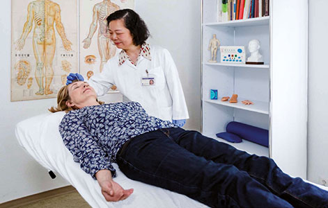 Abbildung: Dr. med. Jiamin Zhang-Wu am UniversitätsSpital Zürich bei der Akupunkturbehandlung Wirksamkeit Die Akupunktur wird oft symptomorientiert zusätzlich zur konventionellen onkologischen Therapie eingesetzt. Die Studien welche die Wirksamkeit von Akupunktur bei einzelnen Symptomen untersucht haben, variieren in der Art und Dauer der Akupunktur, als auch in den Vergleichsgruppen. Übergreifend lässt sich sagen, dass sich zumeist deutlich Effekte der Akupunktur im Vergleich zu keiner Therapie zeigen (z.B. bei tumorassoziierter Fatigue oder Gelenkschmerzen aufgrund der Einnahme von Aromatoseinhibitoren). Hingegen ließen sich Unterschiede zwischen Akupunktur und Scheinakupunktur seltener valide belegen (z.B. Übelkeit und Erbrechen). Dass sich auch mit der Scheinakupunktur klinisch relevante Verbesserungen erzielen lassen, ist ein in der Akupunkturforschung bekanntes Phänomen was vielfältig und kontrovers diskutiert wird. Wenn die Unterschiede zwischen Akupunktur und Scheinakupunktur klein sind, werden sehr große Studien benötigt, um diese statistisch abzusichern. Bisherige Studien bei Mammakarzinom sind jedoch eher klein. Insgesamt sind doch die bisherigen Forschungsergebnisse zur Akupunkturbehandlung von Patientinnen mit Mammakarzinom aber Erfolg versprechend und motivieren zu weiterer Forschung. Im Folgenden soll die Studienlage zu den häufigeren Anwendungsbereichen der Akupunktur bei Mammakarzinom kurz dargestellt werden. Übelkeit und Erbrechen Hitzewallungen Tumorassoziierte Fatigue Nebenwirkung von Aromataseinhibitoren Empfehlungen in Leitlinien Die Arbeitsgemeinschaft Gynäkologische Onkologie empfiehlt Akupunktur sowohl bei postoperativer als auch bei Chemotherapie-induzierter Übelkeit und Erbrechen sowie bei tumorassoziierter Fatigue (http://www.ago-online.de/de/infothek-fuer-aerzte/leitlinienempfehlungen/mamma/). Multimodale Therapie Es ist wichtig zu berücksichtigen, dass Akupunktur nur ein mögliches Therapieverfahren im Bereich der komplementären und integrativen Medizin ist und häufig mit anderen Verfahren kombiniert wird. In einer Studie mit 275 Brustkrebspatientinnen, von denen die Hälfte zufällig zugeteilt am Krankenhaus Meran in Südtirol zusätzliche komplementärmedizinische Therapie bekam, wurde auch Akupunktur angewendet (Witt 2015). Etwa die Hälfte der Patientinnen in der Komplementärmedizingruppe erhielt Akupunktur im Rahmen einer individualisierten multimodalen Therapie. Diese Gruppe hatte nach 3 Monaten eine klinisch relevant bessere Lebensqualität im Vergleich zu der Gruppe die nur Routineversorgung bekam. Akupunktur am UniversitätsSpital Zürich In unserer Ambulanz für komplementäre und integrative Medizin am UniversitätsSpital Zürich behandeln wir häufig Patientinnen mit Mammakarzinom. Wir erstellen für unsere Patientinnen ein individuelles Therapiekonzept, bei dem wir ihre Werte und Wünsche, unsere Behandlungsexpertise und die Evidenz aus klinischen Studien berücksichtigen. Die Akupunktur ist ein mögliches Element des individualisierten Therapiekonzepts und wird häufig mit Verfahren aus der Mind Body Medicine oder Naturheilkunde kombiniert. (Literatur bei der Redaktion) Weitere Informationen: