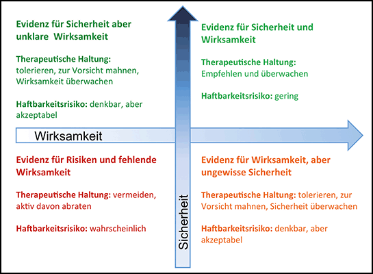 Insgesamt muss bei jeder Methode in Bezug auf Wirksamkeit und Sicherheit abgewogen werden. Die verschiedenen Möglichkeiten zeigt die Abbildung (nach Cohen & Eisenberg 2002). Aber auch die finanziellen Belastungen des Patienten sollten immer mit in die Entscheidungen einfließen, wobei zu Nutzen und finanziellen Belastungen ein vernünftiges Verhältnis bestehen sollte.