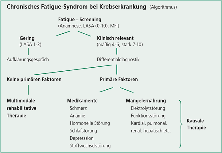 Für die Abklärung einer Fatigue sollten nach einem Screening mögliche primäre Faktoren untersucht werden. Falls keine primären Faktoren gefunden werden, wird eine multimodale Therapie eingeleitet.