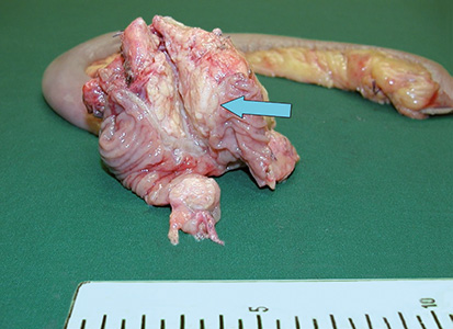 Abb. 3: OP-Präparat eines komplett entfernten Pankreaskopfkarzinoms, der Zwölffingerdarm ist eröffnet, der Tumor angeschnitten (Pfeil). Eine seltene aber relevante benigne Differentialdiagnose stellt die Autoimmunpankreatitis (AIP) dar. Die Inzidenz der AIP wird in benignen Resektaten mit bis zu 30-43% angegeben. Die EUS-geführte Biopsie und der Serumlevel von IgG4 werden für die Diagnosestellung genutzt. Wenn eine AIP vermutet wird, aber histologisch nicht bestätigt werden kann, kann ein Ansprechen auf eine kurzfristige Steroidtherapie wichtige diagnostische Anhaltspunkte liefern. Die komplette Resektion des Tumors ist die einzige potentiell kurative Therapie (Abb. 3). Dennoch beträgt auch hier die 5-Jahresüberlebensrate weniger als 20% in Multicenterstudien und sogar weniger als 5% in Beobachtungsstudien. Eine Sondersituation stellt das lokal fortgeschrittene Karzinom (locally advanced carcinoma) dar, bei welchem keine Metastasen vorliegen, aber aufgrund der Infiltration von Gefäßen der Tumor nicht mehr entfernt werden kann, also inoperabel ist. Auch hier fällt die Entscheidung zur Resektabilität im Zweifel intraoperativ, da solang eine Chance zur Operation besteht, diese dem Patienten nicht vorenthalten werden sollte. Grundsätzlich gilt: solange keine Gefäße infiltriert sind, besteht Resektabilität, das gilt auch für den Befall von venösen Gefäßen. Sind aber die Arterien, z.B. die Arteria mesenterica superior betroffen, kann in aller Regel nicht mehr reseziert werden. In ausgewiesenen Zentren wird hier derzeit der Ansatz von Gefäßprothesen erprobt. Eine detaillierte Indikationsdefinition wurde kürzlich von der International Study Group of Pancreatic Surgery im Sinne eines Expertenkonsensus verfasst (Bockhorn et al. 2014).