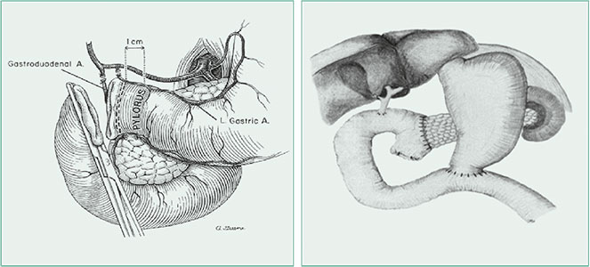 Abb. 4: Pyloruserhaltende Pankreaskopfresektion (PPPD) Der heute bevorzugte Eingriff bei Pankreaskopfprozessen ist die pyloruserhaltende Pancreatico-duodenektomie (PPPD; Abb. 4), welche eine seit den 70er Jahren etablierte Variante der in 30er Jahren beschriebenen Operation nach Kausch-Whipple ist, bei der Magen und der Magenausgang (Pylorus) erhalten werden können. Bei einem kleinen Tumor im Pankreasschwanz kann auch eine Pankreaslinksresektion ausreichend sein. Adjuvante und neoadjuvante Therapie Die adjuvante Therapie mit 6-monatigem Gemcitabin ist seit der CONCO-001-Studie Standard. Dieser konnte auch aus den Daten der ESPAC-3 Studie bestätigt werden. Die adjuvante Therapie kann bis zu 12 Wochen nach der Operation begonnen werden. Eine in Deutschland initiierte Phase II-Studie zur neoadjuvanten Radiochemotherapie versus sofortiger Operation musste wegen mangelnder Rekrutierung abgebrochen werden. Der Nutzen einer neoadjuvanten Therapie gilt bis heute als noch nicht ausreichend belegt und stellt keinen Standard dar.