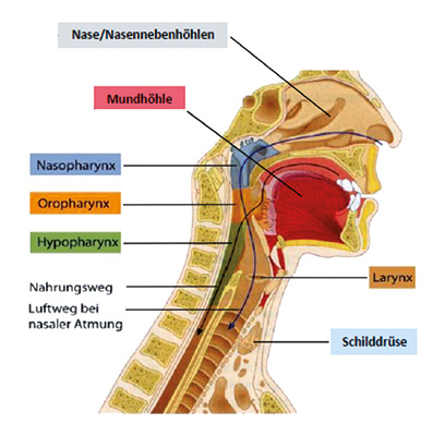 Onkologie , Oberarzt Wenn man von Kopf-Hals-Tumoren spricht, sind eine Vielzahl verschiedener Krebsarten gemeint, die im Kopf-Hals-Bereich angesiedelt sind. Je nach Entstehungsort werden sie entsprechend der anatomischen Regionen eingeteilt. Zu den Kopf-Hals-Tumoren zählen bösartige Tumoren der Nase, der Nasennebenhöhlen, der Mundhöhle, d.h. Tumoren von Lippen, Zunge, Mundboden, Gaumen, des Rachens (Naso-, Oro-, und Hypopharynxkarzinom), des Kehlkopfes (Larynxkarzinom) sowie des äußeren Halses, insbesondere der Schilddrüse und der Speicheldrüsen.