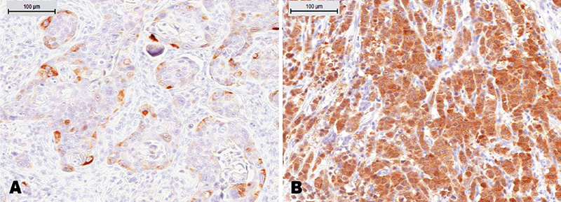 Abb. 2: Immunhistochemische Färbung von Plattenepithelkarzinomzellen mit p16. A) p16 negative Tumorzellen mit nur geringer Anfärbung des p16 Proteins. B) p16 positive Tumorzellen mit starker zytoplasmatischer Anfärbung des p16 Proteins. (Bild zur Verfügung gestellt durch PD Dr. T. Clauditz, Institut für Pathologie, Universitätsklinikum Hamburg-Eppendorf) Bildgebung Um bei dem Verdacht auf einen unklaren Prozess zusätzliche, wichtige Informationen über die Ausdehnung des Tumors und ggf. vorhandener Metastasen zu gewinnen, ist es notwendig, eine entsprechende Bildgebung vom Hals durchzuführen. Hierzu zählen neben einer Sonographie (Untersuchung mittels Ultraschall) zur ersten Orientierung vor allem die Magnetresonanztomographie (MRT) oder die Computertomographie (CT). Die beiden letzteren Verfahren ermöglichen durch hochauflösende Schnittbilddarstellung die Einschätzung des Ausmaßes der Erkrankung und sind unverzichtbarer Bestandteil einer jeden Therapieplanung. Bei histologisch gesichertem Kopf-Hals-Tumor ist es notwendig, eine Ausbreitungsdiagnostik (Staging) vorzunehmen. Es müssen häufig betroffene Organe mittels Ultraschall, CT oder MRT untersucht werden. Hierzu gehören Organe wie die Lunge und die Leber. Ebenso kann das PET-CT bei Tumoren, deren Ursprung nicht gefunden werden kann (CUP = cancer of unknown primary), einen zusätzlichen Informationsgewinn bringen und sollte entsprechend Anwendung finden. Bevor die Therapie beginnen kann, muss eine Stadieneinteilung der Tumorerkrankung erfolgen (UICC Stadium I-IV). Das Stadium wird mit der so genannten TNM-Klassifikation beschrieben. Die TNM Formel unterscheidet sich entsprechend der Lokalisation des Tumors im Kopf-Hals-Bereich und ist grundsätzlich an der Größe des Primärtumors (T) sowie an den befallenen Lymphknoten (N) und anderen Organen (M) orientiert. Generell gefasst, entsprechen Tumore im Stadium I und II einer lokalen Tumorerkrankung ohne Lymphknotenmetastasen am Hals und kleinem Primärtumor (Stadium I: unter 2 cm, bzw. nur eine Unterregion betroffen, Stadium II: 2 bis 4 cm bzw. > als eine Unterregion betroffen). Das Stadium III klassifiziert hingegen eine Gruppe von größeren Tumoren (> als 4 cm bzw. wichtige Unterregionen infiltriert) oder solche Tumoren, die eine einzelne Lymphknotenmetastase auf der gleichen Halsseite aufweisen. Das Stadium IV wird weiter unterteilt in A und B und beschreibt Tumore, die bereits lokal fortgeschritten sind und das betroffene Organ stark durchsetzen, sowie angrenzende Strukturen infiltrieren oder besonders große oder mehrere Lymphknotenmetastasen ausgebildet haben. Das Stadium IVC definiert Tumore jeglicher Größe und unabhängig der betroffenen Halslymphknoten als solche mit bereits aufgetretener Fernmetastasierung (M1 Status). Während der Großteil der Patienten mit dem Stadium I-IVB häufig noch heilbar sind, d.h. eine kurative Behandlung erhalten, kann im Stadium IVC in der Regel nur eine Lebensverlängerung erreicht werden, d.h. eine palliative Behandlung erfolgen, ohne eine Heilung zu ermöglichen. PRÄVENTIONScreening Tumore der Mundhöhle und des Rachens sind in der Regel gut zugänglich und können daher im Rahmen von zahnärztlichen Untersuchungen rechtzeitig erkannt werden. Daher sind regelmäßige Untersuchungen beim Zahnarzt anzuraten insbesondere, wenn es in der Vergangenheit bereits zu wunden Stellen im Mund gekommen ist. Ebenso stellt die Selbstuntersuchung des Mundes im Spiegel eine weitere Möglichkeit dar, Veränderungen frühzeitig zu erkennen und sollte einmal im Monat durch den Patienten erfolgen. Daher bieten viele Zahn- und Hals-Nasen-Ohrenärzte im Rahmen der Krebsvorsorge eine Untersuchung der Mundhöhle sowie des Rachens und Kehlkopfs an. Reduzierung von Risikofaktoren Viele Tumore des Kopf-Hals Bereichs können durch die Vermeidung der Exposition gegenüber Nikotin und Alkohol verhindert werden. Dennoch wird das Risiko, an einem Kopf-Hals-Tumor zu erkranken, sogar noch nach vielen Jahren des übermäßigen Konsums stark gesenkt, wenn das Rauchen oder das regelmäßige Alkoholtrinken beendet wird. Die Exposition gegenüber UV Licht sollte zudem als wichtiger Risikofaktor für Tumore der Gesichtshaut und insbesondere der Lippen durch Vermeidung der Mittagssonne und langen Sonnenbädern minimiert werden. Neben der Vermeidung von Risikofaktoren kann durch eine ausgewogene Ernährung einem Kopf-Hals-Tumor vorgebeugt werden. Wie bei anderen Krebserkrankungen steht die Aufnahme von rotem Fleisch in möglichem Zusammenhang mit Kopf-Hals-Tumoren. Eine pflanzlich basierte Ernährung, die reich an Vitaminen ist (Vitamin C und E), kann sich nach heutigem Erkenntnisstand positiv auf die Vermeidung von Krebs auswirken. Durch die zunehmende Inzidenz von HPV assoziierten Tumoren des Oropharynx (Mund-Rachen) wird die Impfung gegen eine Infektion durch die Hochrisikotypen des Humanen Papillomavirus (HPV 16 und 18) als sinnvolle Präventionsmaßnahme diskutiert. Diese Impfung ist ein sicherer Schutz gegen eine Infektion und gegen die Entstehung von HPV positiven Tumoren, soweit die Impfung vor dem ersten Kontakt mit dem Virus erfolgt. Ist eine Infektion im Jugend- oder frühen Erwachsenenalter bereits erfolgt, stellt die Impfung keinen ausreichenden Schutz dar. THERAPIE Interdisziplinäre Therapieentscheidung im Tumorboard Die Behandlung von Kopf-Hals-Tumoren besteht in einem interdisziplinären, multimodalen Therapieansatz. Somit müssen unterschiedliche Fachdisziplinen (HNO-Chirurgie, Mund-Kiefer-Gesichtschirurgie, Strahlentherapie und internistische Onkologie, Radiologie u.a.) am Tumorboard beteiligt sein, um eine optimale Abfolge der unterschiedlichen Therapieverfahren in Abhängigkeit der individuellen Situation jedes Patienten zu erreichen. Dies bedeutet, dass vor Beginn der Behandlung als auch nachfolgend, bei jeder neu aufgetretenen Krankheitssituation, die an der Behandlung beteiligten Fachdisziplinen zusammenkommen und über die Behandlung eines jede