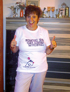 Wie war das mit Krankheiten, die man besiegt hat, hinterher? Man ist offen für Neues, sucht, was hilft, alles zu verstehen. Und es soll nachhaltig stärken. Die Betreuung durch Onkologen war damals nicht so gut, eigentlich hat mich niemand beraten. Ich kümmerte mich selbst, im Juni 2014 ließ ich mich zur Lachyogaleiterin ausbilden. Ich lernte in der Ausbildung viel und verstand endlich alle Zusammenhänge. Jetzt durfte ich einen Lachclub leiten. HAHA leicht gesagt! Erwachsene lachen am Tag nur noch 15mal, aber Kinder 400mal. Und ich wusste, ich musste aufklären und Geduld haben. Meine Lachübungen machte ich mit einer Kollegin in der Apotheke und mit mir alleine. In Beratungsgesprächen bei Patienten erzählte ich auch davon. Seit Januar 2015 leite ich einen kleinen Lachclub, wir treffen uns regelmäßig. Es kommen auch mal Neue dazu, aber es bleiben manche auch wieder fern. Es gibt noch viel aufzuklären, für mich eine Herausforderung, ich habe Geduld. In Wien gibt es eine Lachyogaapotheke und viele Firmen organisieren durch das betriebliche Gesundheitsmanagement „Firmenlachyoga“. Das sind die gesundheitlichen Wirkungen des Lachyogas: