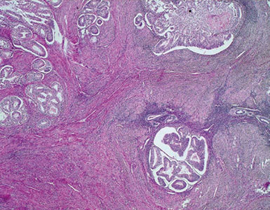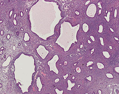 Histologie: Ausgeprägte Drüsenwucherungen, die sich als atypische Drüsenschläuche präsentieren. Die Drüsen liegen zum Teil Rücken an Rücken („dos à dos“) ohne trennendes Bindegewebe und sind von mehrreihigen Epithelzellen ausgekleidet, deren Kerne atypisch blasenförmig vergrößert sind und häufige Mitosen zeigen. Es finden sich Tumorzellnester, die bei höherem Schweregrad das Myometrium infiltrieren.
