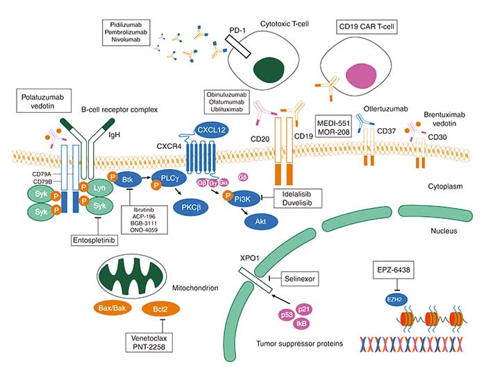 Abb. 3 Therapiestrategie beim follikulären Lymphom Erhaltungstherapie: Trotz der hohen Effektivität der initialen Behandlung kommt es in der Mehrzahl der Fälle nach mehreren Jahren zu einem Rezidiv des Lymphoms. Daher ist nach erfolgreicher initialer Therapie eine anschließende Erhaltungstherapie notwendig. Nach den sehr guten Ergebnissen der sog. PRIMA Studie (Salles G et al. 2011), in der eine zweijährige Erhaltungstherapie mit Rituximab gegenüber einer nach initialer Behandlung nicht weiter therapierten Kontrollgruppe verglichen wurde, wird eine derartige Erhaltung heute als Standard angesehen. In aktuellen Studien wird jedoch sowohl die Dauer der Erhaltung geprüft als auch die Frage einer intermittierenden Erhaltung, die jeweils beim Wiederauftreten von Zeichen der Erkrankung durchgeführt wird. NEUE THERAPEUTISCHE PERSPEKTIVEN Neue Substanzen Antikörper: Auf der Grundlage zunehmender Einblicke in die Biologie follikulärer Lymphome wurde eine Vielzahl neuer Substanzen entwickelt und in klinischen Phase-I- und Phase-II-Studien untersucht. Dazu zählen neue Antikörper, die gegen das CD20-Antigen gerichtet sind, wie Ofatumumab, das eine hohe Einzelaktivität bei rezidivierten follikulären Lymphomen aufwies, aber nicht das Ansprechen bei rituximabrefraktären Patienten verbessern konnte (Karlin L & Coiffier B 2015). Demgegenüber ist Obinutuzumab (GA 101) auch bei rituximabrefraktären Patienten wirksam (Sehn LH et al. 2015). In einer großen, vor kurzem veröffentlichten internationalen Studie zur Erstbehandlung follikulärer Lymphome wurde Obinutuzumab direkt mit Rituximab verglichen. In dieser Studie zeigte sich eine signifikante Verlängerung der krankheitsfreien Zeit durch Obinutuzumab, so daß dieser neue Antikörper neue Standards in der Primärtherapie setzt (Marcus R et al. 2017). Andere neue Antikörper zielen auf weitere B-Zell-spezifische Antigene wie CD22, CD23 und CD80. Erste Studienergebnisse sind heterogen und lassen noch kein klares Bild der Wirksamkeit erkennen. Hochattraktiv erscheint dagegen der Einsatz bispezifischer mit T-Zellen interagierender Antikörper wie Blinatumomab, die gegen CD19 und CD3 gerichtet sind. Insgesamt befinden sich diese Substanzen jedoch noch in relativ frühen Phasen der klinischen Entwicklung. Onkogene Signalwege: Zu den derzeit vielversprechendsten neuen Entwicklungen zählen Substanzen, die in onkogene Signalwege, d.h. in die Steuerungsprozesse von Zellwachstum und Zellstoffwechsel eingreifen. Besonders vielversprechend sind dabei Hemmer des B-Zell Rezeptor-Signalwegs (Abb. 4). Ermutigende Daten liegen bereits zu Inhibitoren des Phosphoinositid-3-Kinase-Signalwegs und der Bruton-Tyrosinkinase vor. Hochinteressante Daten gibt es auch zum Einsatz von BCL-2-Inhibitoren wie GDC-0199.
