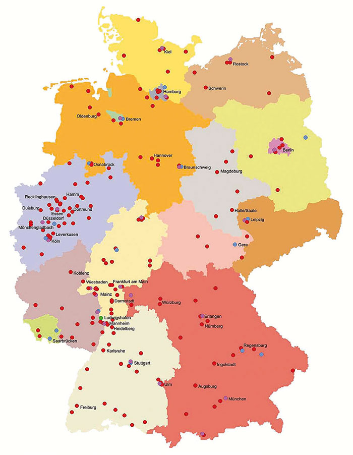 Abb.: Übersicht der Regionalbeauftragten in Deutschland Ein großes Netz von Regionalbeauftragten bildet das Rückgrat der Stiftung LebensBlicke. Heute sind in nahezu allen mittleren und großen Städten Deutschlands Ärztinnen und Ärzte sowie Apotheker für die Stiftung tätig; jedes Bundesland hat einen Fortbildungs-Koordinator. Alle Aktivitäten sind darauf ausgelegt, das Thema Darmkrebsprävention durch Veranstaltungen, Kontakte und durch Pressearbeit kontinuierlich, nicht nur im Darmkrebsmonat, auf der Tagesordnung zu halten. Jährliche Pressekonferenzen zum Darmkrebsmonat März, über 16 Jahre geleitet von Ludwigshafens OB Dr. Eva Lohse, später auch Städtetags-Präsidentin, waren Garant für die bundesweite Aufmerksamkeit. Prominente Persönlichkeiten haben jedes Jahr die Schirmherrschaft übernommen, zuletzt der Baden-Württembergische Ministerpräsident Winfried Kretschmann. Die Stiftung hat sich auch schon sehr früh mit der betrieblichen Darmkrebsvorsorge befasst. Eine große Studie in der BASF (Prof. Andreas Zober, Dr. Stefan Webendörfer) hat seinerzeit die Blaupause entwickelt, nach der betriebliche Darmkrebs-Früherkennung heute in vielen großen, mittleren und sogar kleinen Betrieben angeboten werden kann (3). Die Stiftung LebensBlicke konnte in 20 Jahren viele Persönlichkeiten aus allen Bereichen des öffentlichen Lebens dafür gewinnen, als Befürworter die Ziele der Stiftung zu unterstützen und zum Teil auch über das eigene Darmkrebsscreening zu berichten. Der erste Befürworter war der langjährige Stuttgarter Oberbürgermeister Dr. Manfred Rommel. Befürworter aus der Fußballwelt wie André Schürrle, aus der Comedian-Szene wie Bülent Ceylan und oder Chako Habekost, aus der jüngeren Politiker-Generation wie Daniel Günther und Armin Laschet gehören ebenso dazu wie aus der Wissenschaftsszene Prof. Harald zur Hausen, Nobelpreisträger für Medizin, und Prof. Michel Baumann, Leiter des DKFZ in Heidelberg. Bekannt und sehr akzeptiert sind die LebensBlicke-Symposien wegen der gewohnt hochkarätigen Referenten und der immer aktuellen Themen. Sie sind seit vielen Jahren beim deutschen Internistenkongress, beim nationalen Krebskongress, bei der Jahrestagung der Viszeralmedizin sowie bei der Deutschen Gesellschaft für Endoskopie und bildgebende Verfahren integriert. Abgerundet wird die Informationsverbreitung der Stiftung durch die seit 2013 gebündelte Internetpräsenz (www.lebensblicke.de) mit nationaler und internationaler Ausstrahlung und ca. 140.000 Klicks und 1,5 Millionen Websiteaufrufen pro Jahr. Die Stiftung hat seit 2008 sehr erfolgreich politisch präsent im Nationalen Krebsplan der Bundesregierung mitgewirkt (4). Prof. Dr. J. F. Riemann, Vorstandsvorsitzender, ist Sprecher der Arbeitsgruppe „Weiterentwicklung der Darmkrebs-Früherkennung“.