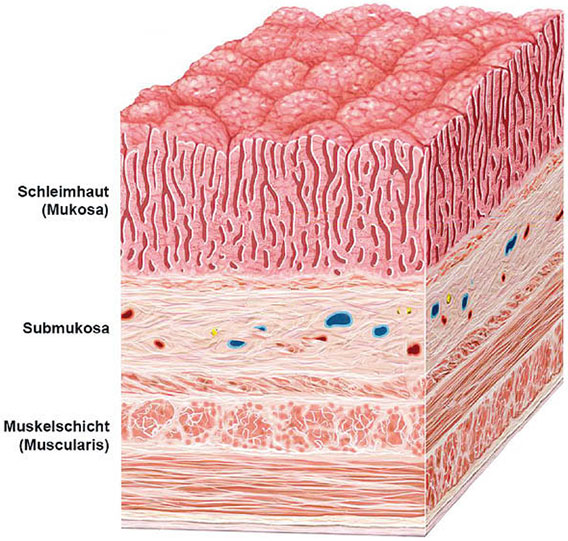 Abbildung 1: Aufbau des Magens und der Magenwand. Abbildung modifiziert nach eref.thieme.de