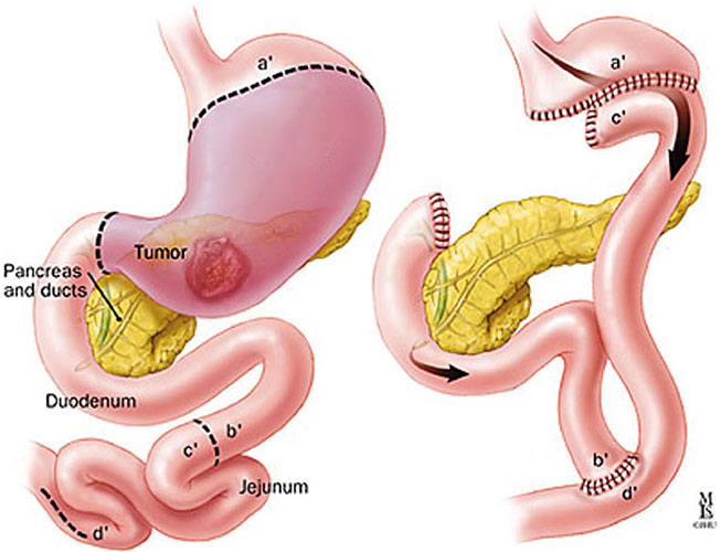 Abbildung 3: Dabei werden der Mageneingang und der Fundus erhalten. Aufgrund der niedrigeren notwendigen Sicherheitsabstände beim Magenkrebs vom intestinalen Typ kann hier häufiger eine Operation unter Erhalt eines Restmagens durchgeführt werden. Alle übrigen Magenkarzinome werden mit einer vollständigen Entfernung des Magens behandelt (Gastrektomie, Abb. 4). Dabei wird der Zwölffingerdarm kurz hinter dem Magenpförtner verschlossen und die Speiseröhre wird knapp oberhalb des Mageneingangs durchtrennt.
