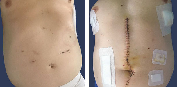 Abbildung 4: Die Entfernung der regionären Lymphknoten des Magens ist bei allen Verfahren obligat und umfasst neben den Lymphknoten, die direkt um den Magen lokalisiert sind, auch die Entfernung der Lymphknoten um die Leber- und die Milzarterie sowie die Lymphknoten um den Truncus coeliacus, aus dem neben der Leber- und Milzarterie auch die linke Magenarterie abgeht, die direkt am Ursprung abgesetzt wird. Dabei werden in der Regel mehr als 25 Lymphknoten entfernt und vom Pathologen untersucht. Um die Nahrungsaufnahme wieder möglich zu machen, muss der Dünndarm an die Speiseröhre genäht werden. Eine direkte Naht des Zwölffingerdarms an die Speiseröhre verbietet sich aus mehreren Gründen: Da der nachfolgende Zwölffingerdarm im Bauchraum fixiert ist, kann dieser nach vollständiger Entfernung des Magens nicht spannungsfrei zur Speiseröhre geführt werden. Zudem würde das gallige Sekret, das im Zwölffingerdarm vorhanden ist, nach vollständiger Entfernung des Magens die Speiseröhre schädigen, da die Reflux-Barrieren des Mageneingangs und des Magenpförtners fehlen. Aus diesem Grund müssen alternative Verfahren gewählt werden. Die in Deutschland am häufigsten durchgeführte ist die sog. Rekonstruktion nach Y-Roux. Hierbei wird eine dem Zwölffingerdarm nachgeschaltete Dünndarmschlinge an die Speiseröhre genäht und der Zwölffingerdarm weiter unterhalb in diese Dünndarmschlinge geleitet. Wurde der vollständige Magen entfernt, ist ein zentrales Problem, dass die Funktion des Magens als Reservoir für den Speisebrei fehlt. Um dieses Problem zum Teil aufzuheben, kann zusätzlich ein „Ersatzmagen“ aus einer Dünndarmschlinge gebildet werden. Dieser Ersatzmagen wird auch „Pouch“ genannt (Abb. 4). Mittlerweile weiß man, dass durch die Pouchbildung keine Steigerung der Komplikationsraten erfolgt, allerdings die Lebensqualität und die Nahrungsaufnahme gerade im späteren Verlauf nach der Operation relevant verbessert sind. Sonderfälle sind Karzinome, die direkt am Mageneingang sitzen (sog. AEG Karzinome). Aktuell wird empfohlen, bei Magenkrebs, der direkt im Mageneingang oder knapp darunter lokalisiert ist, eine Entfernung des gesamten Magens und des unteren Teils der Speiseröhre (sog. transhiatal erweiterte Gastrektomie) durchzuführen. Dabei werden neben den Lymphknoten des Magens auch die Lymphknoten um die untere Speiseröhre entfernt. Während bei den übrigen Verfahren die Neuverbindung zwischen Magen und Dünndarm im Bauchraum liegt, ist diese hier im Brustraum lokalisiert. Liegt die Hauptmasse des Tumors mehr als einen Zentimeter oberhalb des Mageneingangs, dann muss die Speiseröhre (Ösophagus) mitsamt ihrer Lymphknoten bis hoch in den Brustkorb entfernt werden (Ösophagusresektion mit 2-Feld Lymphadenektomie). Meistens ist das Krebswachstum dann auf den Mageneingang beschränkt, so dass ein Teil des Magens erhalten werden kann, aus dem ein Schlauch gebildet wird, der die Speiseröhre ersetzt. Für diese Operation ist nicht nur eine Operation im Bauchraum sondern auch ein Zugang im Brustkorb erforderlich. Dies ist einer der Gründe dafür, dass diese Operation ein sehr viel höheres Risiko bedeutet als die Magenentfernung an sich. Hat der Magenkrebs zu Absiedelungen im Bauchfell (sog. Peritonealkarzinose) geführt, werden diese meistens durch eine Bauchspiegelung vor Einleitung der Therapie gesichert und ihre Ausdehnung mithilfe eines speziellen Punktesystems quantifiziert. Sind diese Absiedelungen sehr begrenzt, kann unter Umständen eine Entfernung des Tumors mitsamt der Absiedelungen ergänzt durch die Spülung des Bauchraums mit heißer Chemotherapie (sog. HIPEC) sinnvoll sein. Minimal-invasive Operation bei Magenkrebs (Schlüssellochchirurgie) Heutzutage werden viele Operationen minimal-invasiv in der sog. Schlüssellochtechnik (laparoskopisch) durchgeführt. Dabei werden statt eines großen Bauchschnitts kleine Schnitte gesetzt, über die eine Kamera und Instrumente in die Bauchhöhle eingebracht werden. Die Vorteile sind – außer des besseren kosmetischen – eine niedrigere Anzahl an Narbenbrüche sowie häufig auch eine schnellere Rekonvaleszenz. In der Tumorchirurgie stellt sich aber immer auch die Frage, ob die Ergebnisse hinsichtlich der vollständigen Entfernung des Tumors und seiner Lymphabflussgebiete der offenen Chirurgie ebenbürtig sind. Für frühe Stadien des Magenkrebses konnte in Studien gezeigt werden, dass beide Verfahren offensichtlich hinsichtlich ihrer Radikalität vergleichbar sind. Für fortgeschrittene Magenkarzinome gibt es ebenfalls gute Hinweise, dass die minimal-invasive Chirurgie sicher durchführbar ist.