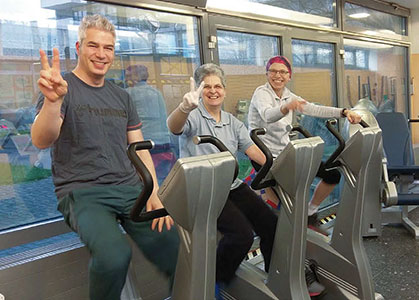 Schon vor meiner OP war mir die onkologische Trainings- und Bewegungstherapie des Zentrums für Integrierte Onkologie Köln-Bonn (OTT) wärmstens empfohlen worden , (s. a. Aktuelle Gesundheitsnachrichten, Heft 28/2018, S. 26-28), so dass ich wusste, was meine Hauptbeschäftigung während der Chemotherapie neben zwei wöchentlichen Yogasitzungen sein würde: Sport. Ich treibe gerne Sport und freue mich, in den letzten Jahren hier Routinen entwickelt zu haben, um körperlich einigermaßen fit zu bleiben. Ich bin gerne montags bis freitags zur OTT gegangen. Der langgezogene Trainingsraum ist eigentlich ein Korridordurchgang und befindet sich in der Frauenklinik. Gegenüber sieht man die schwangeren Frauen mit Partner kommen und frisch gebackene Familien wieder gehen. Meine Söhne sind dort geboren. Das ist irgendwie lebensbejahend. Ich habe mir bei der OTT das FOLFOX (Chemotherapie) regelrecht „aus den Rippen geschwitzt“, wie es die Oma eines Freundes bestimmt ausgedrückt hätte. Trainieren kann man übrigens auch mit einem Stoma relativ problemlos und – wenn der Wille stark genug ist – auch während des eigentlichen Chemozyklus. (Man besorgt sich ein sog. Stomaband, das wie ein Mieder um den Bauch gebunden wird.) Ich kann nur jedem raten, in dieser nicht angenehmen Phase Sport unter professioneller und freundlicher Anleitung zu treiben, wie ich es bspw. bei der OTT erlebt habe. Es hat mir die Lebensqualität erhalten und die Härte der zwölf Zyklen entscheidend abgemildert – davon bin ich felsenfest überzeugt. Geholfen hat auch mit Sicherheit das Training auf den Vibrationsplatten, mit dem versucht wird, den Polyneuropathien an Händen und Füßen präventiv zu begegnen (es gibt bis auf Sensomotoriktraining sonst keine andere Therapiemöglichkeit). Das Missempfinden an Fingern und Füßen tritt fast zwangsläufig wegen der Platinprodukte auf, die man während der FOLFOX-Chemo zu sich nimmt (Oxaliplatin). Es tut schließlich auch gut, unter Gleichgesinnten zu sein, weil man im gemeinsamen Gespräch besser über die Krankheit hinwegkommt.