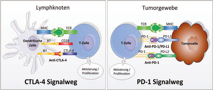 Abb. 3: Funktionsprinzip der Immuntherapie mittels CTLA-4 Antikörper und PD1-Antikörper Die Wirkung dieser Therapie (mit Ipilimumab) benötigt Zeit; zum Teil bis zu 3 Monate oder länger – und tritt nicht selten erst nach einem initialen „Pseudoprogress“ ein, der bei der Bewertung der bildgebenden Diagnostik bedacht werden muß. Dabei stellt eine vermehrte Immunreaktion sich zunächst als scheinbare Zunahme der Tumormasse dar, bevor eine Verkleinerung oder Stabilisierung der Metastasen eintritt. In Studien hat Ipilimumab eine signifikante Verlängerung des Gesamtüberlebens im Vergleich zu einem Vakzine-Arm bzw. versus Chemotherapie gezeigt [6]. Allerdings wurden auch schwere immunvermittelte Nebenwirkungen beobachtet [7]. Das Nebenwirkungsspektrum der Therapie mit Ipilimumab unterscheidet sich wesentlich von dem der zielgerichteten Therapien und Standardchemotherapien. Daher ist eine sorgfältige Aufklärung der Patienten sowie ein adäquates Nebenwirkungsmanagement durch therapieerfahrene Zentren essentiell. Insbesondere kann es im Therapieverlauf zum Auftreten einer schweren autoimmunvermittelten Kolitis (Durchfälle) kommen sowie zu einer Hypophysitis (Entzündung der Hirnanhangdrüse), die eine differenzierte Diagnostik und Nebenwirkungsmanagement mit z.B. systemischer Kortisontherapie erforderlich machen. Weiterhin kann es zum Auftreten von Hautausschlägen und immunvermitteltem Leber- und Nierenwertanstieg kommen. Für das Nebenwirkungsmanagement wurden spezielle Leitlinien ausgearbeitet [8]. Nachdem mit Ipilimumab erstmalig ein Langzeitüberleben bei ca. 20% der Patienten erzielt werden konnte [9], wurde im Jahr 2015 mit der Neuzulassung der PD1-Antikörper Nivolumab und Pembrolizumab die Therapie des metastasierten malignen Melanoms nochmals deutlich verbessert. Als neue Optionen in der Immuntherapie zeigten die PD1-Antikörper ein rascheres und besseres Ansprechen mit wesentlich geringerem Nebenwirkungsprofil [10] . PD-1 (Programmed Death 1) ist ebenfalls ein wichtiger Immuncheckpoint-Rezeptor, der eine Immunsuppression (Unterdrückung der Abwehrkräfte) vermittelt. Die Tumorzellen machen sich diesen Mechanismus der Immunsuppression zu Nutze. Durch eine medikamentöse Hemmung dieser „Bremse“ kann das Immunsystem die Tumorzellen wieder erkennen und aktiv angreifen. Diese Interaktion zwischen Tumorzelle und Immunzelle findet unmittelbar im Tumorgewebe statt. Dies könnte die schnellere und effektivere Ansprechrate erklären, wenn man diese mit den primären Effekten der Anti-CTLA-4-Therapie im lymphatischen Gewebe vergleicht. Die Verabreichung des Antikörpers erfolgt als Infusion über die Vene, je nach Medikament alle 3-4 Wochen. Üblicherweise erfolgte eine Kontrolle, ob die Therapie angeschlagen hat, mittels Schnittbildgebung nach 2-3 Monaten. Wenn in der Verlaufskontrolle ein Ansprechen in der Bildgebung festgestellt wird, ist dies in der Regel auch anhaltend, selbst wenn eine Therapiepause beispielsweise wegen Nebenwirkungen eingelegt werden muss. Als weitere Therapieoption besteht mittlerweile auch die Zulassung, den PD1-Antikörper Nivolumab mit dem Vorgängermedikament Ipilimumab als Kombinationstherapie zeitgleich zu verabreichen [11], was zu einer weiteren Verbesserung der Ansprechrate führt. Das bedeutet jedoch, dass mit erheblich höheren Nebenwirkungen gerechnet werden muss und die Indikation daher sorgfältig abgewogen werden sollte. Im Gegensatz zur Monotherapie ist hier ein Verlauf ohne jegliche Nebenwirkungen selten und auch schwere Nebenwirkungen sind wesentlich häufiger. Kombinierte Immuntherapie bedeutet also mehr Wirkung zum Preis von deutlich mehr Nebenwirkungen. In der Regel entscheidet der Patient selbst, ob er gewillt ist, mehr Nebenwirkungen in Kauf zu nehmen. Sehr betagte, multimorbide Patienten sollten jedoch auf jeden Fall die nebenwirkungsarme und gut verträgliche Monotherapie erhalten. Zusammenfassung und Ausblick Die medikamentöse Therapie des fernmetastasierten malignen Melanoms hat sich in den letzten Jahren entscheidend gewandelt. Mit der erstmaligen Zulassung der Immuntherapie Ipilimumab 2011 konnte ein verbessertes Ansprechen und erstmals auch ein verlängertes Langzeitüberleben erzielt werden. Hinzu kam die zielgerichtete Therapie mit den B-RAF-Inhibitoren Vemurafenib und Dabrafenib (Zulassung 2012 und 2013) beim inoperablen oder fernmetastasierten malignen Melanom mit B-RAF-positivem Mutationsstatus, welche inzwischen standartmäßig mit einem MEK-Inhibitor kombiniert werden. Eine hohe Ansprechrate und eine oftmals schnelle Tumormassenreduktion kennzeichnen den Therapieverlauf der zielgerichteten Therapie. In manchen Fällen kommt es jedoch auch zu Resistenzbildung. Die seit 2015 zugelassene Immuntherapie mit den PD1-Antikörper Pembrolizumab bzw. Nivolumab zeigen eine noch bessere Wirkung im Vergleich zu Ipilimumab und das bei sehr guter Verträglichkeit. Eine Kombinationstherapie von Nivolumab mit Ipilimumab erhöht die Ansprechrate weiter, jedoch auch die Rate der Nebenwirkungen. Wenn die Immuntherapie anschlägt, bestehen für den Patienten hohe Chancen auf ein Langzeitansprechen. Nur in Einzelfällen bilden sich die Metastasen im Körper vollständig zurück, aber auch eine teilweise Rückbildung oder eine stabile Erkrankungssituation, in welcher der Patient keine Beschwerden hat und die Metastasen im Körper dauerhaft aufgehört haben zu wachsen, kann als Erfolg betrachtet werden. Die Kosten dieser Therapien sind im Vergleich zur Chemotherapie um ein vielfaches höher. Sie werden jedoch im Rahmen der Zulassung von den Krankenkassen übernommen. Weitere neue Medikamente (z.B. auch Medikamente, welche die Tumorumgebung im Gewebe positiv beeinflussen) sowie neue Kombinationsmöglichkeiten z.B. einer Dreifachtherapie mit PD1-Antikörper plus zeitgleiche Gabe von BRAF-und MEK-Inhibitor werden im Rahmen von Studien derzeit untersucht. (Literatur bei der Autorin)