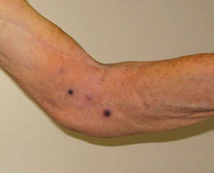 Abb. 2: Hautmetastasen können beim metastasierten malignen Melanom in Form von schwarz pigmentierten Knoten (Abb. links) oder als rötliche Knoten auftreten (Abb. rechts). Für die Behandlung des metastasierten malignen Melanoms bieten heute die nachfolgend dargestellten medikamentösen Therapien den optimalen Standard. Das Zellwachstum abschalten: Zielgerichtete Therapie durch Kinaseinhibitoren B-RAF ist ein Protein, das in den Zellen des Körpers für das normale Zellwachstum aktiviert wird. Beim malignen Melanom führt eine Mutation des B-RAF-Proteins dazu, dass das Signal zum Zellwachstum angeschaltet bleibt und somit zu unkontrolliertem Tumorwachstum führt. Eine B-RAF-Mutation ist beim malignen Melanom in ca. 40% bis 60% der Fälle nachweisbar [1,2]. Die Mutationsanalyse wird am Gewebe des Primärtumors bzw. des Tumormaterials der Metastasen gemäß der S3-Leitlinie bereits ab Stadium IIIB durchgeführt [3]. So wird bei diesen Hochrisikopatienten im Falle einer Fernmetastasierung bzw. bei nicht operabler Tumorsituation ein unmittelbarer Therapiebeginn möglich. Es ist durchaus empfehlenswert, auch mehrfach Mutationstestungen im Therapieverlauf bei neuaufgetretenen Metastasen durchzuführen, um die Therapiesituation möglichst aktuell beurteilen zu können. Liegt eine Mutation des Proteins vor, spricht man von einem B-RAF-positiven malignen Melanom und eine zielgerichtete Therapie mit einem sogenannten B-RAF-Inhibitor ist möglich. Im Jahr 2012 wurde in Deutschland als erstes der B-RAF-Inhibitor Vemurafenib zugelassen. In einer Phase III-Studie wurden fernmetastasierten und inoperablen Melanompatienten (Stadium IV und IIIC) Vemurafenib in einer Dosierung von 960 mg p.o. (Tabletteneinnahme) zweimal täglich verabreicht. Im Vergleich zur Chemotherapie [4] zeigte sich hierbei eine signifikante Verbesserung der Überlebensraten. Als zweiter B-RAF-Inhibitor wurde im Folgejahr Dabrafenib in einer Dosis von 150 mg p.o. zweimal täglich zugelassen. In der entsprechenden Phase III-Studie mit Dabrafenib im Vergleich zur Chemotherapie zeigten sich vergleichbare Ergebnisse [5]. Das objektive Ansprechen lag bei 50% versus 6%. Bemerkenswert ist, dass auch Melanompatienten mit hoher Tumorlast von der Behandlung mit einem B-RAF-Inhibitor profitieren. Das Nebenwirkungsspektrum beider Medikamente ist ähnlich, unterscheidet sich dennoch in einigen Aspekten. Unter Therapie mit Vemurafenib muss vermehrt mit Photosensitivität (erhöhte Lichtempfindlichkeit, Neigung zu Sonnenbränden) gerechnet werden und bei Anwendung von Dabrafenib kann es zum Auftreten von Fieber kommen. Unter beiden Medikamenten können Gelenkschmerzen, Hautausschläge, Müdigkeit, Übelkeit, Juckreiz und gehäuft Keratoakanthome (gutartige Hauttumore) auftreten. Engmaschige Kontrollen der gesamten Haut durch den Hautfacharzt sind daher empfehlenswert. Um eine weitere Verbesserung des Ansprechens zu bewirken, wird der jeweilige BRAF-Inhibitor mittlerweile standartmäßig mit einem sogenannten MEK-Inhibitor als Kombinationstherapie verabreicht. Wenn die Tumorzelle die Hemmung über BRAF umgeht, kann das Zellwachstum weiterhin blockiert werden, durch die Hemmung des MEK-Proteins weiter unterhalb im gleichen Signalweg. Eine Kombination beider Medikamente bietet also die optimale Wirkung. Manchmal wird die Dauer des Ansprechens jedoch trotzdem durch die Ausbildung von Resistenzmechanismen begrenzt. Bei geringer Tumorlast, geringer Dynamik und geringen klinischen Beschwerden sollte daher zunächst eine Immuntherapie erwogen werden. Das körpereigene Immunsystem aktivieren: Immuntherapien durch Antikörper induzierte „Checkpoint-Blockaden“ Unabhängig vom Mutationsstatus besteht beim metastasierten malignen Melanom die Option einer Immuntherapie. Die hier zum Einsatz kommende Art von Medikamenten verstärkt die bereits vorhanden Fähigkeit des Immunsystems zur Krebsbekämpfung durch die Gabe von monoklonalen Antikörpern. Auch hier ein kurzer Rückblick auf die Entwicklung der letzten Jahre: Zunächst erfolgte 2011 erstmalig die Zulassung von Ipilimumab. Die Infusionen wurden in einer Dosierung von 2 mg/kg/Körpergewicht im Abstand von jeweils drei Wochen durchgeführt. Bei guter Verträglichkeit wurde nach der vierten Gabe die Therapie abgeschlossen und die weitere Wirkung abgewartet. Das Funktionsprinzip des CTLA-4 Antikörpers Ipilimumab besteht in der Aktivierung des Immunsystems. Das CTLA-4 (zytotoxische T-Lymphozyten-assoziierte Antigen 4) ist ein hemmender Rezeptor, der die Immunzellen herunter reguliert und damit als natürliche „Bremse“ des Immunsystems fungiert. Durch die Blockade mittels des CTLA-4-Antikörpers wird das inaktivierende Signal verhindert und sozusagen die „Bremse des Immunsystems“ gelöst (Abb. 3).