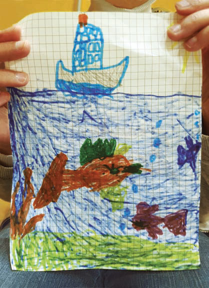 Ein weiteres Bild drei Wochen später ist ebenfalls ermutigend. Die exotischen Wesen im Wasser sind gut sichtbar und vital. Das (Lebens-)Schiff schwimmt wohlauf und zeigt in die richtige Richtung. Vielleicht deutet der rote Fleck noch etwas Fremdes an, es scheint jedoch gut integriert und nicht bedrohlich. Wieder steht das Bild in einem seltsamen Kontrast zur klinischen Lage. Zum weiteren Behandlungsverlauf: Die adjuvante Immununterstützende Therapie spricht in der Folge an. Und tatsächlich ist die junge Patientin vier Monate später nach einer MRT-Bildkontrolle tumorfrei! Die kleine Patientin legte uns dazu das abgebildete Bild frei.