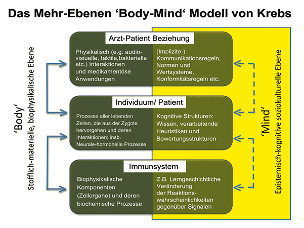 Abbildung 7: Die Mehr-Ebenen Mind-Body Konzeption der Ätiologie von Krebs Diese Kurzbeschreibung des Mehr-Ebenen Modells führt zu drei Fragen, die wir kurz behandeln wollen. Erstens, was genau ist eine Mind-Body Beziehung in der Arzt-Patienten Beziehung? Zweitens, welche physiologischen, molekularen biochemischen Prozesse sind wissenschaftlich bekannt, um diese Interaktion (auf der Ebene des Body) zu beschreiben? Und drittens, welche Forschungsfragen müssten beantwortet werden, oder, wie sähe eine profunde naturwissenschaftliche Forschung aus, um die Validität dieser Annahmen zu beschreiben, d.h. etwa eine positive oder negative Auswirkung der (nichtmedikamentösen) Arzt-Patient Beziehung. Wir wissen aus der Kleingruppenforschung[10], dass es in Gruppen bewusste und unbewusste Regeln und Mechanismen gibt, welche die Interaktion, das Verhalten und Erleben der Gruppenmitglieder beeinflussen. Wir sprechen hier von Gruppennormen, (impliziten) Entscheidungs- und Verhaltensregeln, Gruppendruck, Mechanismen der Selbst- und Fremdwahrnehmung usw. Wir betrachten diese Regeln als den ’Mind’ einer Gruppe. Der ’Body’, d.h. die materiellen und biophysikalischen Strukturen einer Gruppe bestehen aus den physiologischen Prozessen in den Körpern der Gruppenmitglieder sowie den materiellen-biophysikalischen Interaktionen zwischen den Gruppenmitgliedern. Dazu gehören Schall- und Lichtwellen der Kommunikation, Berührungen, Medikamentenverabreichung etc. Obwohl nun die Beziehung zwischen der therapeutischen Allianz und dem Patienten als Mitglied dieser materiell sind, wirkt das immaterielle Gruppengefüge sich indirekt auf das Erleben des Individuums, d.h. den Mind des Individuums/Patienten aus. Dies wird durch den gestrichelten Pfeil zwischen der ersten und zweiten Ebene rechts dargestellt. Die Arzt-Patienten Beziehung kann als Kleingruppe (Dyade) aufgefasst werden. Aber zur therapeutischen Allianz bei den Mayas gehören auch die mit der Krankheit konfrontierten und in den Heilungsprozess einbezogenen Familienmitglieder[28]. Nimmt man an, dass Patient und Arzt (und die Familienmitglieder) die spirituellen Regeln der Mayas über Entstehung von Krankheiten teilen, so wird die therapeutische Allianz von einem gemeinsamen Referenzsystem getragen, welches Empfinden, Emotion, Aktivierung (Arousal) und Verhalten beeinflusst. Natürlich werden auch Wahrnehmung, Selbstbeobachtung und das Aktivierungsniveau des Patienten durch diese Prozesse beeinflusst. Die basalen Annahmen des Mehr-Ebenen Modells lauten, dass die in der therapeutischen Allianz wirkenden spirituellen und kulturellen Regeln auf das Empfinden und die damit verbundenen neuropsychologischen Prozesse wirken. Die zweite Frage bezog sich auf die neuropsychologischen Prozesse. Gut bekannt ist, dass die Wahrnehmung oder Kognizierung von bedrohlichen Gefahren aus der Umwelt das zentrale Nervensystem veranlasst, Starter-Moleküle („neuro-effectors“ wie Noradrenalin) über die Hirnanhangsdrüse (Hypophyse, pituitary gland) zu emittieren, die in der Nebenniere (‚adrenal gland’) physiologische Prozesse einleitet, welche die Aktivität des Immunsystems verändern. Das Endokrine System ist im gesamten Körper mit dem peripheren Nervensystem und damit mit dem Gehirn und dem zentralen Nervensystem verbunden. Von Bedeutung sind hier auch Zytokine, d.h. Proteine wie Interferone oder Interleukine, deren Produktion die Aktivität des Immunsystems steuern[29]. Gut untersucht ist die Bedeutung von (dauerhaftem) Stress auch in seiner Wirkung auf Krebs[21, 30, 31]. Zu beachten ist, dass sich die negativen Auswirkungen von Umweltbedingungen auf den Gesundheitszustand offenbar leichter beschreiben lassen als die positiven. Bemerkenswert ist, dass wir in den letzten Jahren – ausgehend von den eingangs geschilderten Ansätzen von Cohen und Matzinger – eine Vielzahl von Beiträgen in hochstehenden Zeitschriften wie Nature Reviews Immunology[32], Nature Reviews[29] oder Lancet[21] finden, welche das Wirkungsgefüge zwischen kognitiven Prozessen und Prozessen im Zentralen Nervensystem zugleich zellbiologisch-genetisch wie systemisch beschreiben. Auch finden sich Studien, die zeigen, dass Stress weniger auf die Geschwindigkeit des Wachstums des Primärtumors als auf die Metastasierung wirkt[33]. Die Befundlage hier ist nicht einheitlich; es gibt auch Untersuchungen, welche positive Wirkungen von bestimmten Formen von Stress auf die Immunaktivität indizieren. Will man die Wirkung einer Maya-Krebs Therapie beschreiben, so ist es wichtig zu verstehen, welche Teile des Gehirns (wie z.B. Hypothalamus, Amygdala, Hippocampus) in welcher Weise von anderen Informationsverarbeitenden Gehirnteilen (z.B. dem Präfrontalen Kortex, Cingulären Kortex) aktiviert werden, um relevante Aktivitäten zur Krebsabwehr im Immunsystem auszulösen. Heute ist klar, dass hier z.B. verschiedene Interleukine und Interferone für zellexterne (z.B. bakterielle) oder zellinterne (z.B. virale) Abwehr von Bedeutung sind. Es sind also erste psychoneuroimmunologische Zugänge gefunden und man kennt aus Laborversuchen Interleukine, welche zur Elimination von Krebszellen führen[32]. Um nun aufzuzeigen, ob eine Maya Therapie positive Wirkung auf die Krebsheilung besitzt – und hiermit kommen wir zur dritten Frage – muss man einerseits wissen, unter welchen Bedingungen das Immunsystem Krebstumorzellen erkennt und/oder in deren Ausbreitung oder Metastasierung interveniert. Andererseits sollte man wissen, welche (Gefahren-)Signale von Krebszellen Immunzellen zur Elimination der malignen Tumorzellen aktivieren. Würde man dies kennen, so ließe sich mittels klinischer Untersuchungen prüfen, welche psychoneuropsychologischen Prozesse dazu beitragen, gute Bedingungen für die Arbeit des Immunsystems zu schaffen. Genau an dieser Stelle ist die onkologische Grundlagenforschung gefordert. Es braucht Modelle, die erklären, wann und unter welchen Bedingungen welche Signale von Krebszellen als Gefah