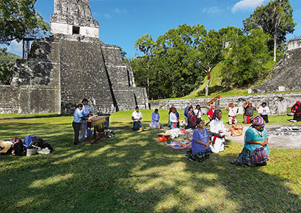 Abbildung 1: Die heutigen Mayas sind Nachfahren einer der drei Hochkulturen Mittel- und Südamerikas. Heute leben, grob geschätzt, etwas mehr als 6 Millionen Personen in Guatemala und den umliegenden Ländern von Guatemala, die sich als Mayas bezeichnen. Zeremonien, in denen Zeichen der Götter gelesen werden, sind für die traditionellen Mayas auch heute von Bedeutung. Das Bild zeigt Mayas in der Anfangsphase der Zeremonie zur Vorbereitung des 2. Workshop in Tikal am 13. 01. 2011. Dort haben die fünf beteiligten Ältestenräte eine Affirmation zur Zusammenarbeit im Macocc Projekt gegeben. Trotz grosser Fortschritte der Psychoneuroimmunologie werden in der Schulmedizin psychologische, soziale oder gar spirituelle Faktoren der Ätiologie von Krebs als marginal betrachtet und nur bei Einzelfällen herangezogen, für die gängige Theorien keine Erklärung liefern. Um Missverständnissen vorzubeugen, sei an dieser Stelle angeführt, dass wir annehmen, dass alle Lernprozesse mit differenzierten biophysikalisch-chemischen Prozessen verbunden sind. Es wird aber postuliert, dass – wie schon etymologisch im Begriff „in-form-ation“ dargelegt – biotische Systeme ab einer bestimmten Entwicklungsstufe aus den molekularen Strukturen Formen oder Muster extrahieren, die dann zu bedeutungsvollen Signalen werden können, welche das Verhalten dieser Systeme beeinflussen. In-Beziehung-Setzung von Maya Wissen und onkologischem Wissen über Krebs Warum ist das medizinische Wissen der Mayas von Interesse? In Guatemala lebt heute der Grossteil der über 6 Millionen Menschen, die sich als Nachfahren der um 900 kollabierten Hochkultur der Mayas bezeichnen. Wir finden heute allein in Guatemala über 20 verschiedene Maya-Sprachen sprechende ethnolinguistische Gruppen, welche – je nach geographischer Lage und historischen Einflüssen – mehr oder weniger traditionelles Wissen und Lebensweise repräsentieren. Die Maya Hochkultur zeichnete sich durch eine hoch entwickelte Mathematik, erstaunliche Präzision bei astronomischen und kalendarischen Berechnungen, ein zyklisches Zeitkonzept, eine aus einer Verbindung von Zeichen und Silben (Glyphen) bestehenden Sprache und eine elaborierte, von einem Schöpfer und vielen Göttern/Geistern und – vereinfacht dargestellt – aus Unterwelt, Himmel und Erde bestehendes Universum aus. Das energetische Potential (Lebensenergie) – und damit in gewisser Weise auch ein gesundheitliches Potential – eines Menschen wird durch den Zeitpunkt der Geburt bestimmt, da nach der Maya Kosmologie jeder Mensch mit einem Nawal, d.h. einem Geist in Verbindung steht, welcher das energetische Profil des Menschen bestimmt. Die Dokumentation von medizinischem Wissen der Mayas aus der präkolumbischen Zeit ist sehr beschränkt, da die spanisch-christliche Konquisation zu Mitte des 16 Jahrhunderts den allergrössten Teil der schriftlichen Dokumente und Inschriften beinhaltenden Stelen vernichtete. Es gibt aber einige Dokumente, wie das heilige Buch Popul Vuh[13], in denen an einigen Stellen medizinisches Wissen oder Pflanzen zur medizinischen Behandlung dargestellt werden. Die Mayas haben ein ganzheitliches Konzept von Gesundheit und Krankheit, in dem religiös-spirituelle Kräfte eine zentrale Rolle spielen. Krankheiten werden im Grundsatz als eine Verletzung der Balance, des Gleichgewichts oder der Harmonie des Individuums mit dem Universum verstanden. Hier ist interessant, dass die Mayas keinen Umweltbegriff kennen, da sie sich selbst mit dem Universum verwoben sehen. Krankheiten entstehen aus der Verletzung und dem mangelnden Respekt vor der Natur (auch Steine werden in unserem Sinne als „lebend betrachtet“), sowie aus Verletzungen von Grundprinzipien der sozialen Ordnung oder religiöser Prinzipien. Einige Krankheiten werden z.B. in Verbindung mit einer Besitzergreifung durch (böse) Geister interpretiert. Auch Epidemien werden in ähnlichen Kontexten interpretiert.